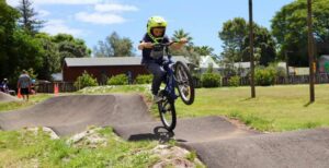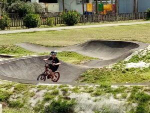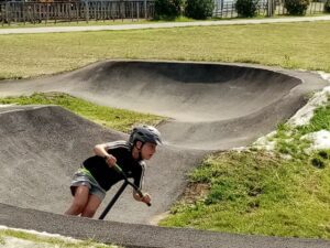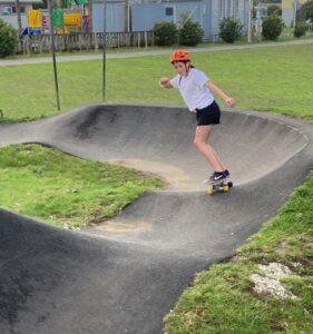 Whananaki School built a concrete track right around their school with a point-to-point pump track in the middle. Because the track is asphalt and concrete, it can be used by bikes, scooters, and skateboards.